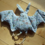 8. Enfin, j’ai cousu la deuxième partie de la pression sur le tissu à motif, en face de la première une fois les ailes repliées. Puis j’ai brodé un museau et un œil pour donner un peu de vie à Madame Chauve-souris.